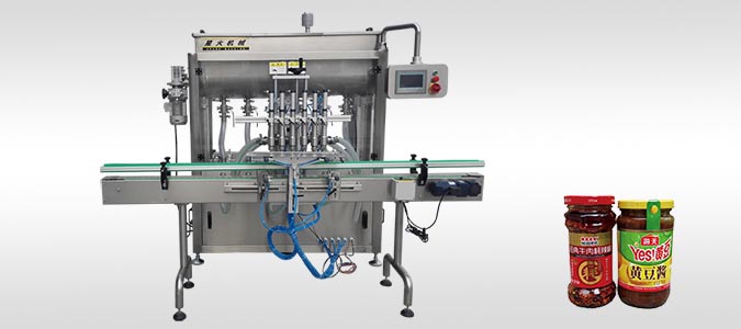 2、麻辣醬灌裝機|豆豉醬灌裝機|六頭全自動醬料灌裝機配帶攪拌功能,解決了辣椒醬等顆粒物料的分層現象,并且使灌裝更加精確。